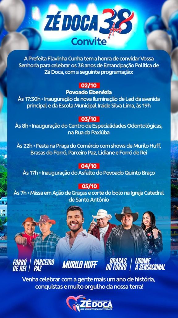 A programação do aniversário de 31 anos de Governador Nunes Freire começou a ser oficializada na live, entre as inaugurações, que brevemente serão melhores detalhas nas redes sociais, shows com Mayara e Maraísa, show gospel com Jerson Rufino e muitas outras atrações.