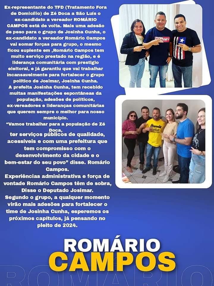 Romário tem o apoio da prefeita de Zé Doca Josinha Cunha e dos deputados Josimar Maranhãozinho e Detinha